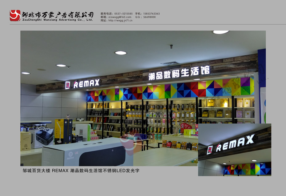 邹城百货大楼四楼手机卖场 REMAX潮品数码馆LED发光字制作安装